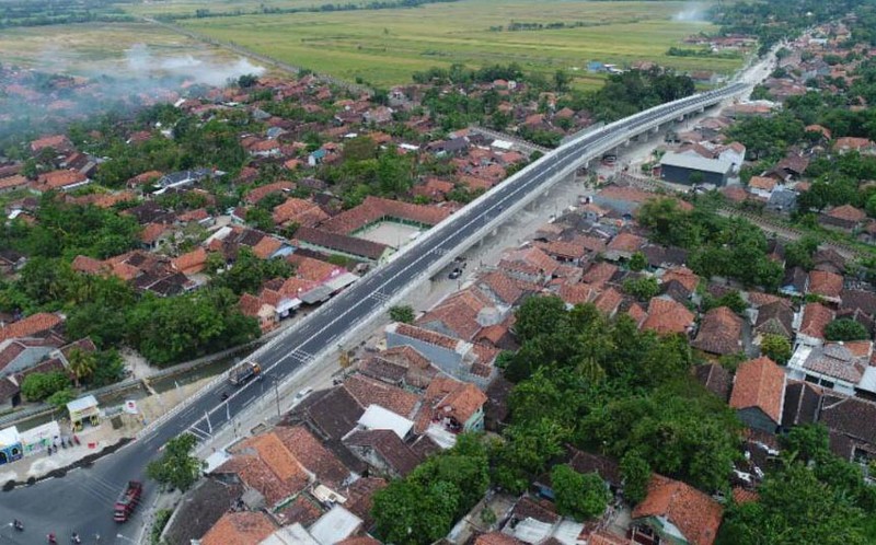 Flyover Dermoleng. Berbeda dengan jalan tol fungsional, jalur yang dibuka tetap dua arah dengan masing-masing satu lajur. Kini, para pemudik yang akan menuju ke Purwokerto, setelah keluar di exit Tol Pejagan pun dapat menikmati empat buah flyover yang saat ini sudah fungsional. Pool/Dok. Kementerian PUPR.