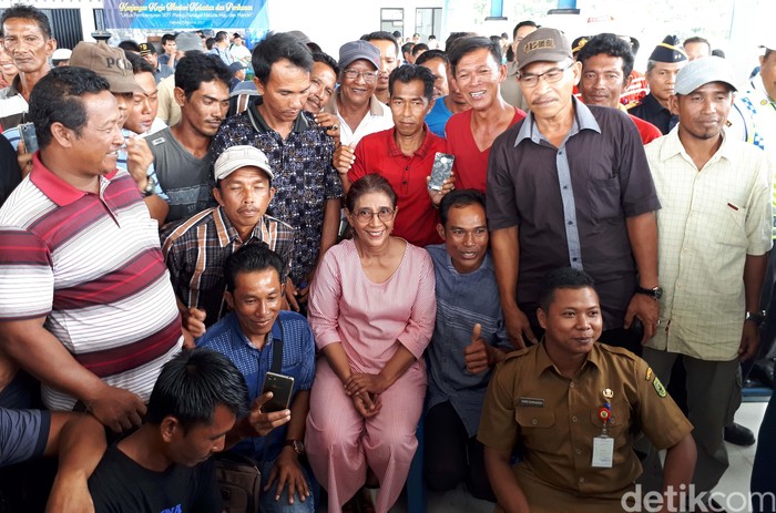 Jakarta - Menteri Kelautan dan Perikanan Susi Pudjiastuti blusukan ke Desa Semalau, Pulau Tiga, Kabupaten Natuna. Ia memakai sandal jepit dan dibonceng sepeda motor.