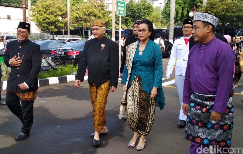 Sri Mulyani sendiri mengenakan pakaian adat Jawa dengan kebaya berwana hijau dibalut dengan kain batik.