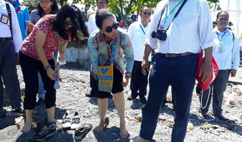 Rini meninggalkan pantai sambil menenteng sepatunya.