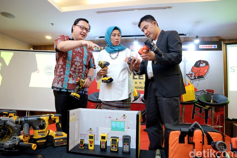 Co Founder Tokopedia Leontinus Alpha Edison, Direktur Kemenperin Endang Suwartini, dan Country Director Stanley Black and Decker Indonesia King Hartono Hamidjaja mencoba perkakas Stanley di Jakarta, Senin (14/5/2018). Dok. Stanley Black & Decker