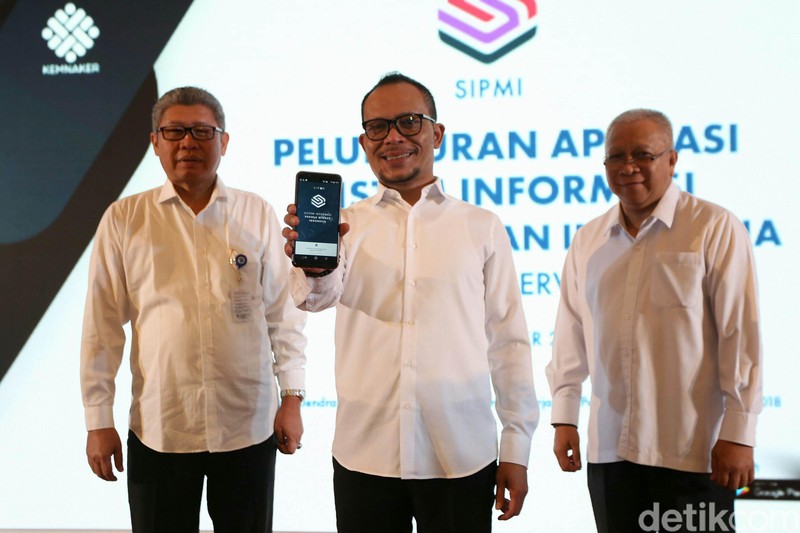 Sekretaris Jenderal Kementerian Ketenagakerjaan Khairul Anwar, Menteri Ketenagakerjaan Hanif Dhakiri, dan Kepala Pembinaan Penempatan Tenaga Kerja (BINAPENTA) & Perluasan Kesempatan Kerja (PKK) Kementerian Ketenagakerjaan Maruli Apul Hasoloan meluncurkan aplikasi Sistem Informasi Pekerja Migran Indonesia (SIPMI) di Kantor Kementrian Ketenagakerjaan, Jakarta, Kamis (27/12/2018).