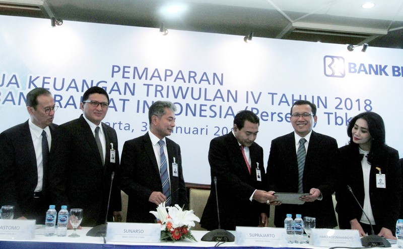 Direktur Utama Bank BRI Suprajarto (tengah) memaparkan hasil kinerja BRI bersama dengan jajaran direksi BRI di acara Laporan Keuangan Kinerja Triwulan ke-4, di Jakarta, Rabu (30/1/2019). Foto: dok. BRI