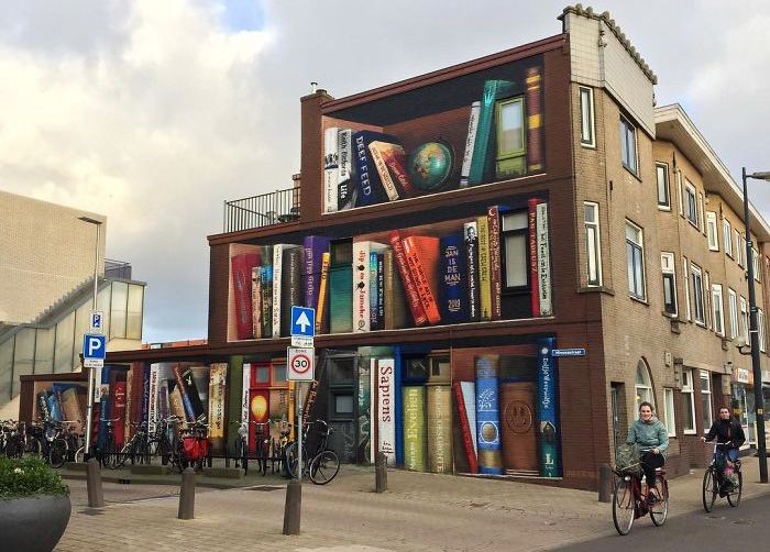 Belanda - Tampilan apartemen ini terbilang unik. Di salah satu sisinya memperlihatkan seolah-olah dia rak buku raksasa.