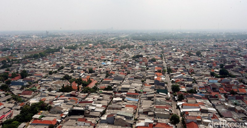 Penampakan permukiman penduduk dari atas ketinggian di wilayah Kota Depok, Jawa Barat, Selasa (17/12/2019).