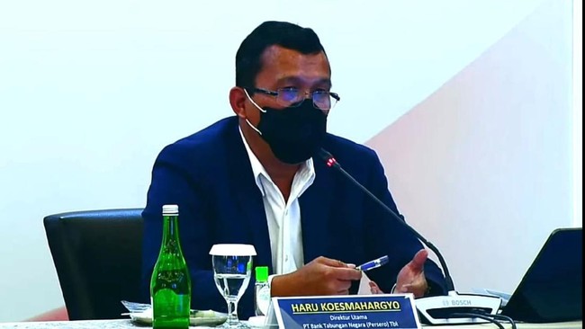 Direktur Utama PT Bank Tabungan Negara (Persero) Tbk. Haru Koesmahargyo menyampaikan paparan kepada sejumlah media pasca pengumuman Badan Pusat Statistik atas prestasi ekonomi Indonesia yang tumbuh 7,07% yoy pada triwulan II/2021 di acara Press Conference Himbara di Jakarta.