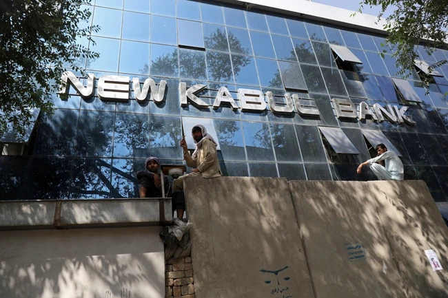 Orang-orang Afghanistan duduk di dinding saat orang-orang menunggu berjam-jam untuk menarik uang. Para pejabat mengatakan pejuang Taliban telah memasuki Kabul dan mencari penyerahan tanpa syarat dari pemerintah pusat.