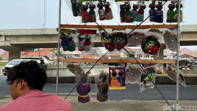 Jakarta - Miniatur ondel-ondel dijajakan di kolong jembatan tol Becakayu, Jl Kalimalang Raya, Kota Bekasi. Ondel-ondel ini dibuat dari barang bekas.