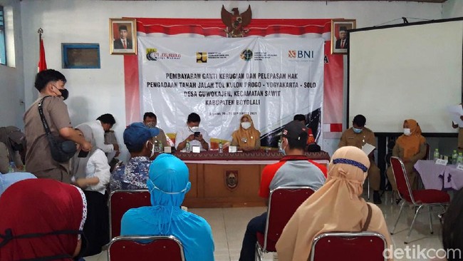 Pembayaran ganti kerugian dan pelepasan hak pengadaan tanah jalan tol Kulon Progo - Yogyakarta - Solo, dilakukan di Balai Desa Gowokajen, Kecamatan Sawit, Kabupaten Boyolali, Senin (20/9/2021).