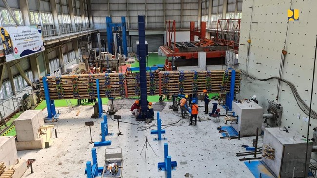 Balai Bahan dan Struktur Bangunan Gedung, Direktorat Bina Teknik Permukiman dan Perumahan, Direktorat Jenderal Cipta Karya melaksanakan pengujian untuk mengukur kelayakan bahan bambu sebagai suatu sistem matras guna meningkatkan daya dukung tanah dasar di lokasi konstruksi Jalan Tol Semarang-Demak.Foto: Dok. Kementerian PUPR