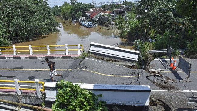 Lombok Barat - Jembatan Meninting yang menghubungkan Kota Mataram dan Kabupaten Lombok Barat rusak akibat banjir bandang. Begini kondisnya.