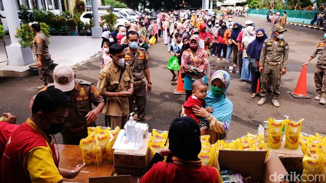 Tangerang Selatan - Warga Tangerang Selatan mengantre panjang demi mendapatkan minyak goreng dengan harga murah. Lewat operasi pasar, minyak goreng dijual Rp 14 ribu per liter.
