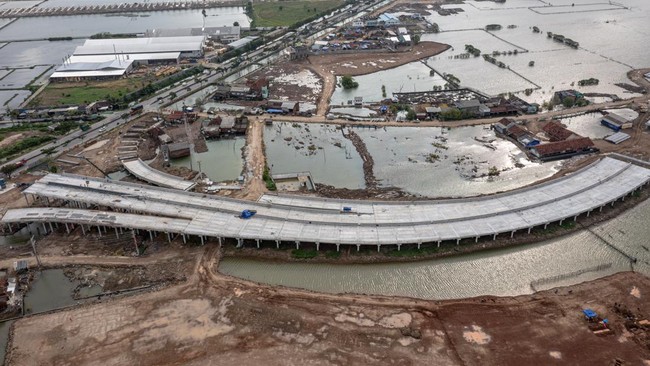 Foto udara proyek pembangunan Jalan Tol Semarang-Demak seksi II di Kecamatan Sayung, Kabupaten Demak, Jawa Tengah, Rabu (19/1/2022).