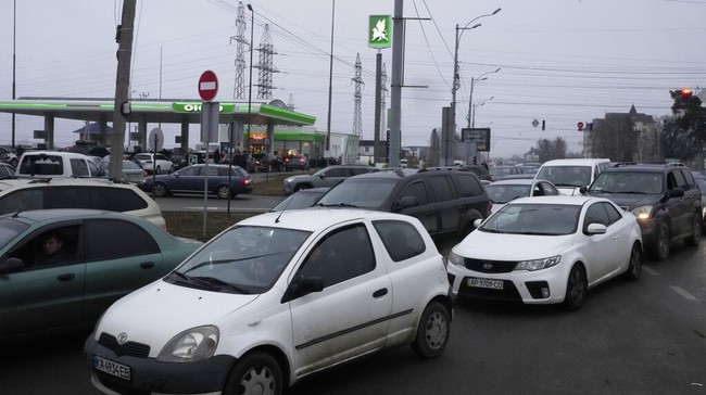 Ukraina - Invasi besar-besaran Rusia membuat panik warga Ukraina. Terlihat warga mulai mengantre isi BBM hingga ambil uang di ATM untuk meninggalkan ibu kota.
