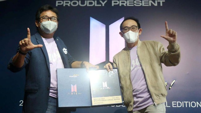 (Ki-ka) Senior Executive Vice President Micro & Consumer Finance Bank Mandiri Josephus K. Triprakoso dan Chief Executive Officer iStyle.id Steven Calvin Victory pada peluncuran BTS (The Fact Music Awards) TMA 2021 Photobook Special Edition di Hardrock Cafe, Jakarta, Jumat (25/2).