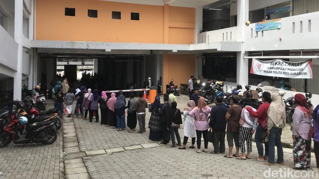Sukabumi - Operasi Pasar Murah (OPM) minyak goreng digelar di Pasar Pelita, Sukabumi. Menariknya, warga yang sudah antre minyak goreng ini harus mencap jari ke tinta.