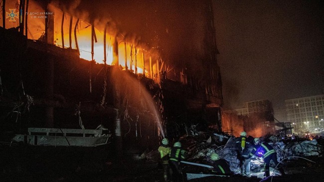 Ukraina - Peluru kendali (rudal) Rusia masih menyasar sejumlah titik di Ibu Kota Ukraina seperti menyasar salah satu pusat perbelanjaan. Terbakar, hancur dan jadi puing.