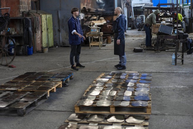Ukraina - Menghadapi desingan peluru Rusia, warga mengubah pelat besi menjadi rompi anti peluru. Pembuatannya memanfaatkan peralatan di sebuah bengkel kerja seniman.