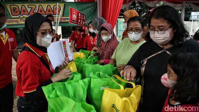 Warga membeli kebutuhan pokok di Bazar Murah Ramadan di kawasan kantor Dinas Perindustrian Perdagangan Koperasi Usaha Kecil Menegah (PPKUKM), Kelapa Gading, Jakarta Utara, Rabu (29/3/2022).