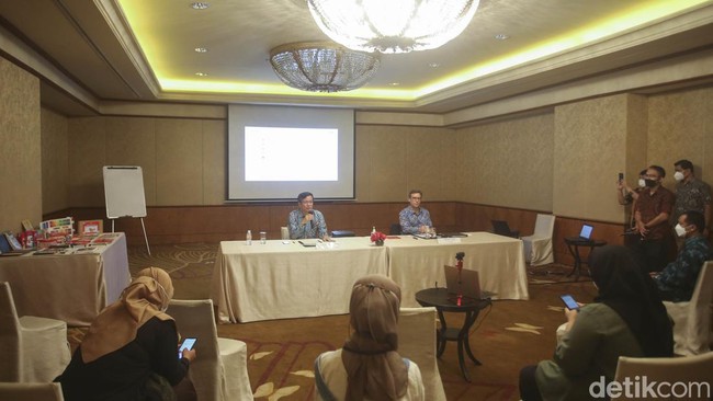 Managing Director PT Faber-Castell International Indonesia Yandramin Halim (kiri) dan CEO Faber-Castell AG Stefan Leitz (kanan) memberikan pemaparan terkait produksi alat tulis Faber Castell di Jakarta, Sabtu (9/4/2022).