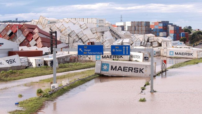Afrika Selatan - Banjir yang menerjang Afrika Selatan turut menghanyutkan sejumlah peti kemas. Massa sempat menjarah beberapa peti kemas. Aktivitas di pelabuhan Durban lumpuh.