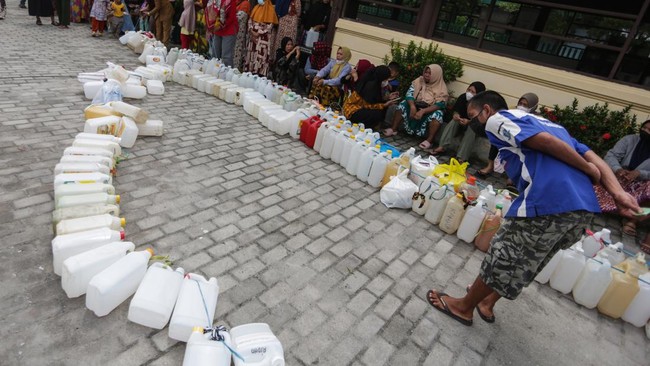 Palangka Raya - Masyarakat di Palangka Raya mengantre membeli minyak goreng curah saat operasi pasar murah minyak goreng karena masih tingginya harga di pasaran. Ini potretnya.