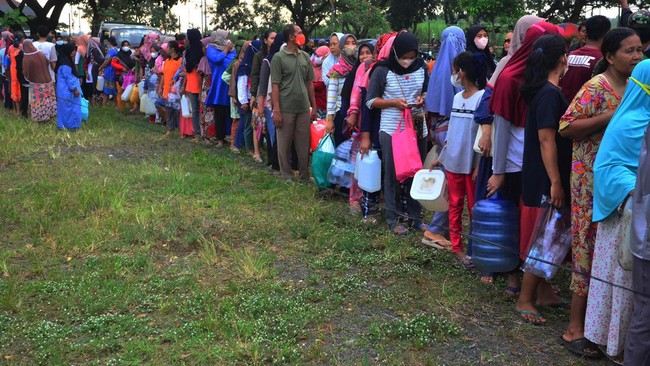 Kudus - Operasi pasar minyak goreng curah digelar di Lapangan Desa Megawon, Kudus, Jawa Tengah. Warga tampak antre.