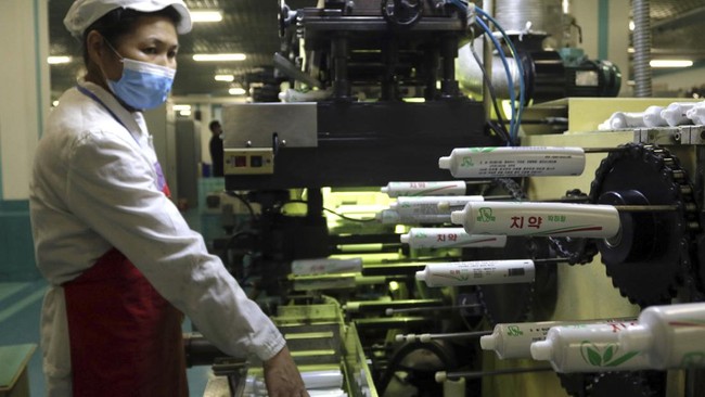Pyongyang - Pemimpin Korea Utara Kim Jong Un memerintahkan lockdown nasional imbas pandemi. Namun ada beberapa pengecualian sepeti sebuah pabrik odol di Pyongyang ini.