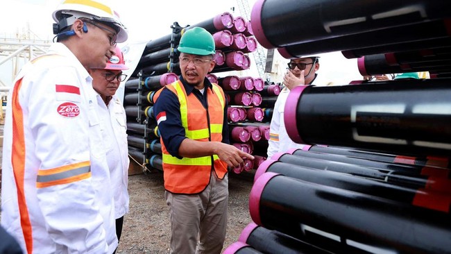 Kepala Divisi Pengelolaan Rantai Suplai dan Analisis Biaya SKK Migas Erwin Suryadi mendengarkan penjelasan dari President Director PT Citra Tubindo Tbk., Satya Heragandhi saat peninjauan pengeksporan produk pipa transmisi gas di Pelabuhan SCN Logistics Kabil, Batam, Kepulaua Riau. Peninjauan tersebut dalam rangka Pra Forum Kapasitas Nasional 2022 wilayah Sumbagut.