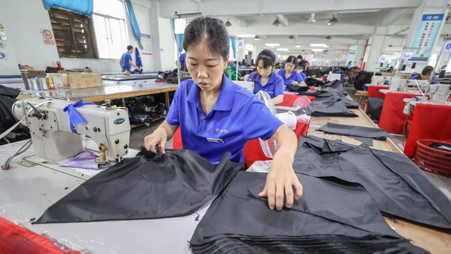 Sejumlah karyawan bekerja di lini produksi payung di sebuah pabrik di Jinjiang, Kota Quanzhou, Provinsi Fujian, China, Jumat, (24/6/2022). Mereka memilih dan menjahit bahan untuk pembuatan payung. VCG via Getty Images