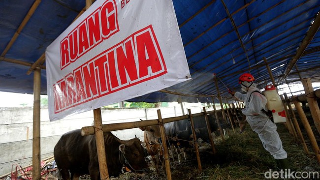 Jakarta - Beragam upaya untuk mencegah penyebaran PMK jelang Idul Adha terus dilakukan. Salah satunya dengan menyemprotkan disinfektan di area penjualan sapi kurban.