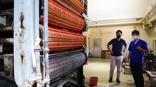 Jun Onishi, kiri, anak sulung generasi kelima, cicit dari pendiri dan putra kepala eksekutif saat ini, dan Kenji Kobayashi, yang mengepalai pabrik Nittosha, berbicara satu sama lain di pabrik Nittosha di Himeji, Jepang, Rabu, (29/6/2022).