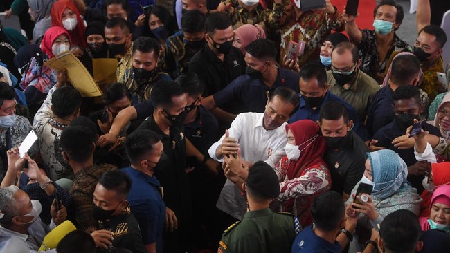 Presiden Joko Widodo (tengah) menerima ajakan berswafoto warga usai acara pemberian Nomor Induk Berusaha (NIB) pelaku Usaha Mikro Kecil (UMK) perseorangan tahun 2022 di Jakarta, Rabu (13/7/2022).