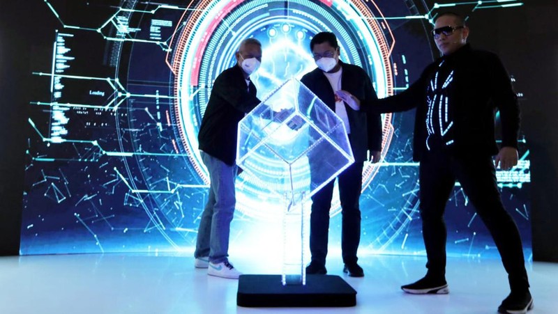 Dirut Bank Mandiri Darmawan Junaidi dan Wadirut Bank Mandiri Alexandra Askandar mendengarkan penjelasan seorang general banker saat seremoni cabang digital.