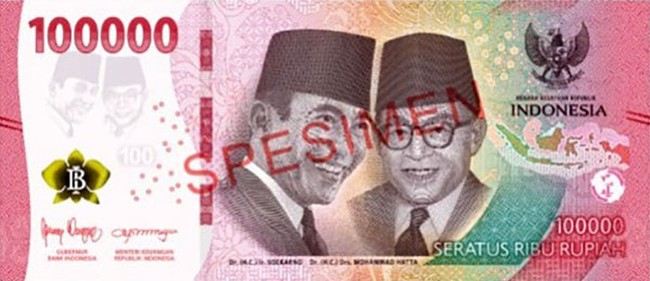 Bagian depan Rp 100.000 menampilkan Tokoh Proklamator Kemerdekaan Republik Indonesia, Ir. Soekarno dan Drs Mohammad Hatta, sebagai gambar utama. Terdapat lambang negara Garuda Pancasila, gambar kepulauan Indonesia, Bunga Anggrek Bulan, dan beberapa motif khas Indonesia.