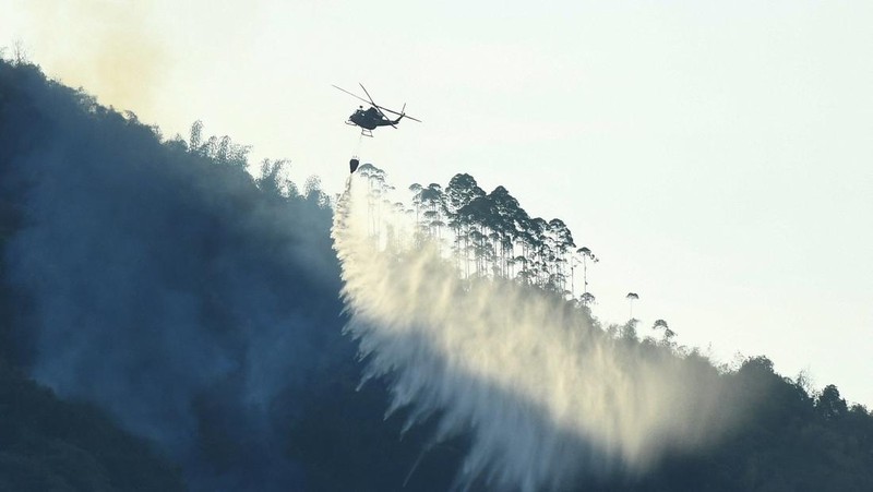 Sebuah helikopter berusaha memadamkan kebakaran hutan yang terjadi di tengah suhu panas di Chongqing, China pada 19 Agustus 2022. cnsphoto via REUTERS