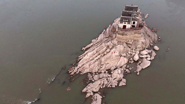 China - Gelombang panas ekstrem mengakibatkan volume air Sungai Yangtze menyusut. Paviliun Guanyin berusia 700 tahun yang sebelumnya terendam pun muncul ke permukaan.