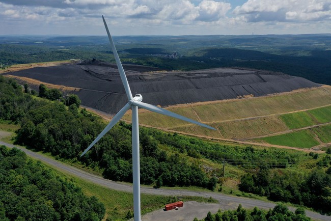 Kontras, Barisan Turbin Angin Ini Bersisian dengan Onggokan Batu Bara