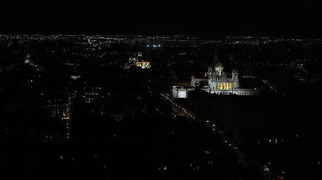Pemandangan dari udara Ibu Kota Madrid yang gelap gulita, Selasa (13/9/2022). Beberapa bangunan di area tertentu mematikan lampu sedangkan beberapa lainnya masih bisa dihidupkan.