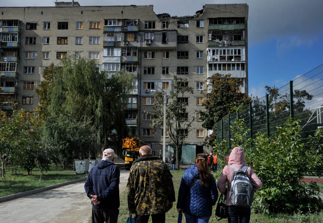 Warga lokal melihat apartemen setengah hancur yang terkena rudal Rusia di Kharkiv. Foto: SOPA Images/LightRocket via Gett/SOPA Images