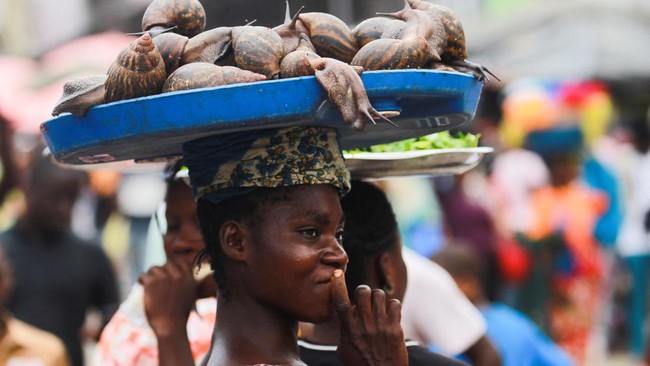 Seorang gadis membawa siput alias bekicot untuk dijual di pasar Adjame di Abidjan, Pantai Gading, Kamis, (15/9/2022). Bekicot Afrika, adalah jenis bekicot raksasa yang dagingnya sangat berharga di Pantai Gading. Populasi di habitatnya pun kian menipis karena banyak diburu hingga penebangan hutan.