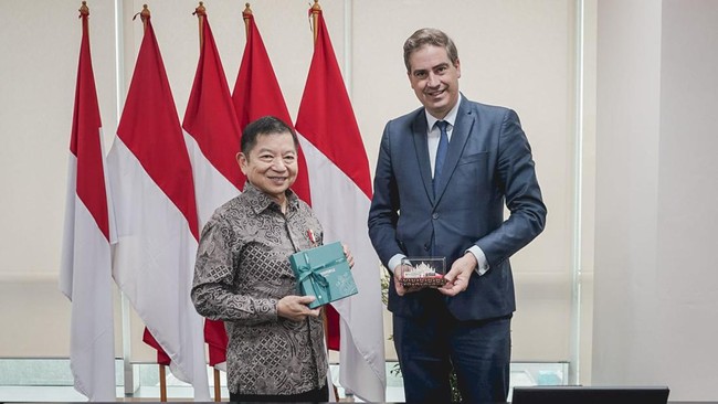 Jakarta - Menteri Suharso Monoarfa kedatangan tamu Menteri Perdagangan Luar Negeri Prancis Oliver Becht sebagai mitra strategis dalam kerjasama bidang transisi energi.