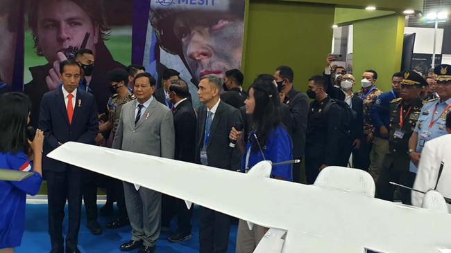 Jakarta - Presiden Joko Widodo (Jokowi) beserta Menteri Pertahanan Prabowo Subianto mengunjungi booth PTDI di Indo Defence Expo & Forum 2022. Begini momennya.