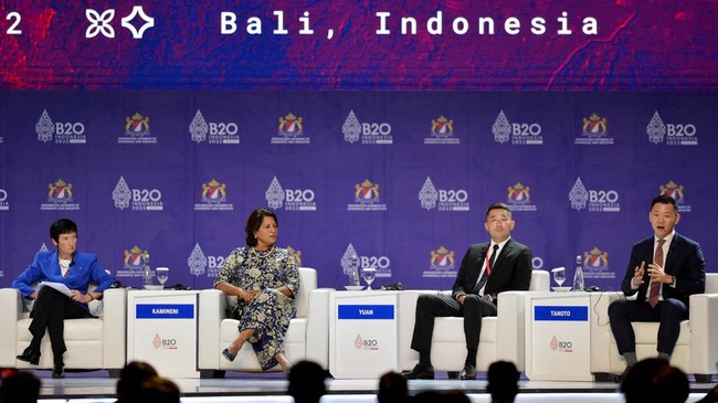 Managing Director RGE Group Anderson Tanoto (dari kanan) bersama President Director Virtue Dragon Nickel Industrial Park Zhou Yuan dan Executive Vice Chairperson Appolo Hospitals Enterprise Limited Shobana Kamineni menjadi pembicara dalam gelaran Business20 (B20) Summit Indonesia 2022, yang digelar sebagai bagian dari KTT G20 di Bali.