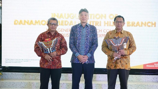 Direktur Utama PT Bank Danamon Indonesia Yasushi Itagaki bersama Asisten Direktur Kantor Perwakilan Bank Indonesia Sumatera Utara Bambang Utomo dan Direktur Lembaga Jasa Keuangan OJK Regional 5 Sumbagut, Untung Santoso, saat meresmikan kembali kantor cabang Danamon Putri Hijau di Medan, Sumatera Utara.