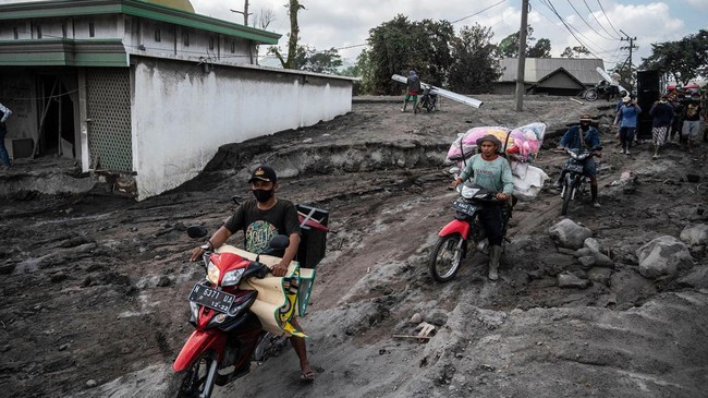 Lumajang - Erupsi gunung Semeru di Lumajang telah menghancurkan sejumlah infrastruktur. Lahar dingin gunung Semeru juga menerjang jalan, jembatan hingga rumah.