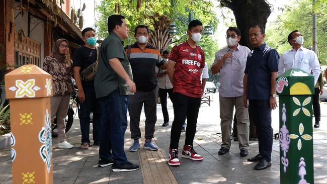Solo - Menteri BUMN Erick Thohir dan Menteri Investasi/Kepala BKPM Bahlil Lahadalia mengecek lokasi pesta rakyat Kaesang-Erina. Mereka ditemani Wali Kota Solo Gibran.