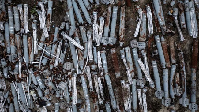 Ukraina - Ribuan rudal MLRS milik Rusia telah jatuh di Ukraian selama perang berlangsung. Begini potret sampah rudal milik Rusia yang dikumpulkan di Kharkiv.