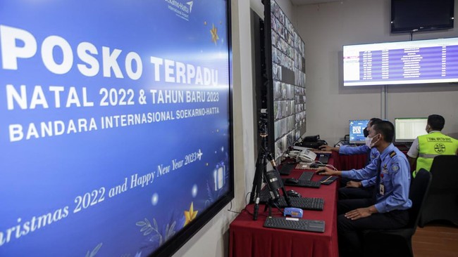 Petugas melakukan pemantuan CCTV angkutan Natal dan Tahun Baru di Posko Terpadu Natal dan Tahun Baru di Bandara Internasional Soekarno Hatta, Tangerang, Banten, Selasa (20/12/2022).
