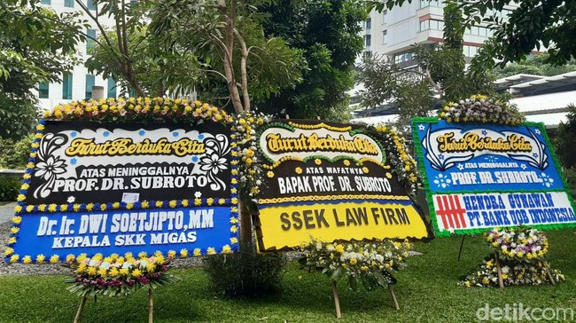 Jakarta - Eks Menteri Pertambangan dan Energi (kini ESDM) Prof Subroto meninggal dunia. Karangan bunga duka cita pun membanjiri Kementerian ESDM, Jakarta, Rabu (21/12).